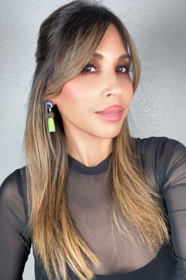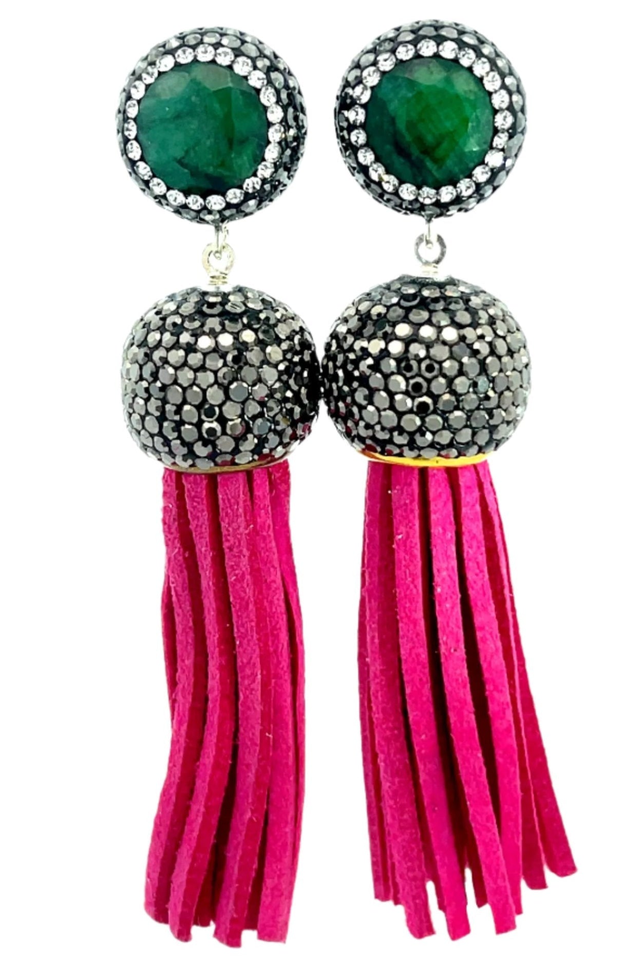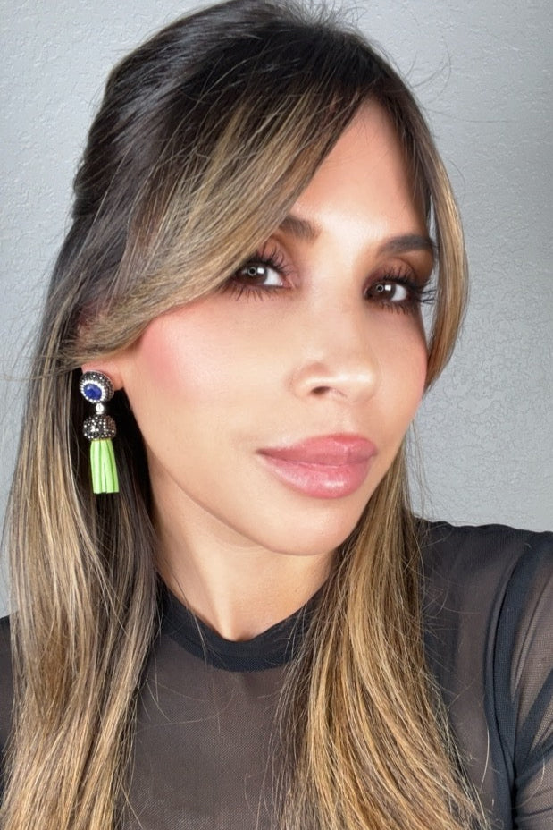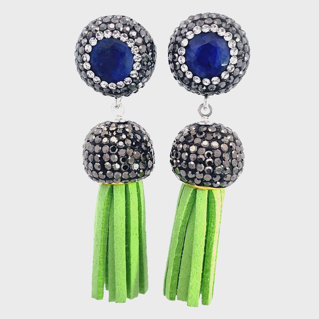 Add some flair to your outfit with our short leather tassel earrings! Made with sterling silver posts and adorned with a gemstone surrounded by sparkling crystals. Elevate your look with this unique and playful accessory.