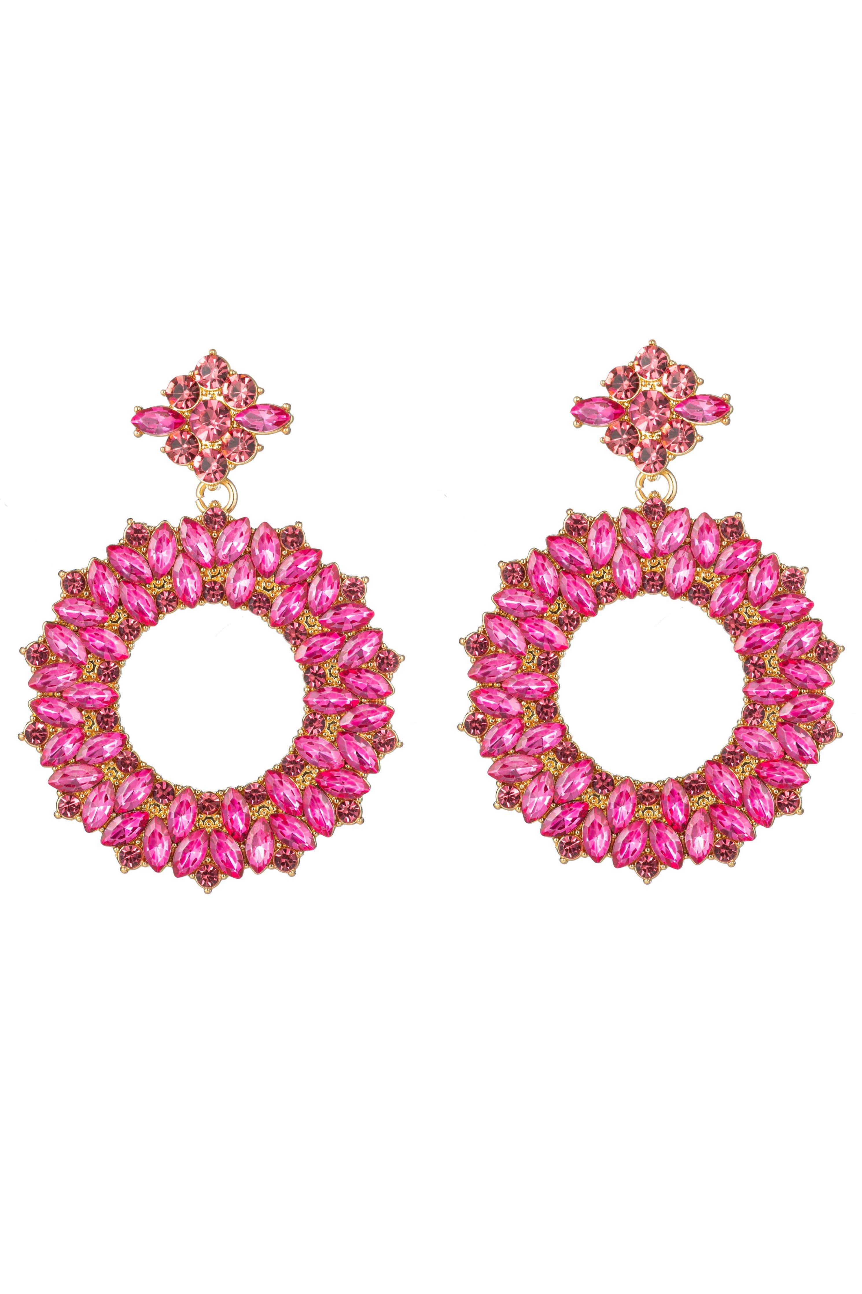 Add a splash of color to your ensemble with these stunning loop earrings! Shimmering gold alloy and bright pink colored glass crystals dance amongst each other to give these drop earrings their stunning appeal.