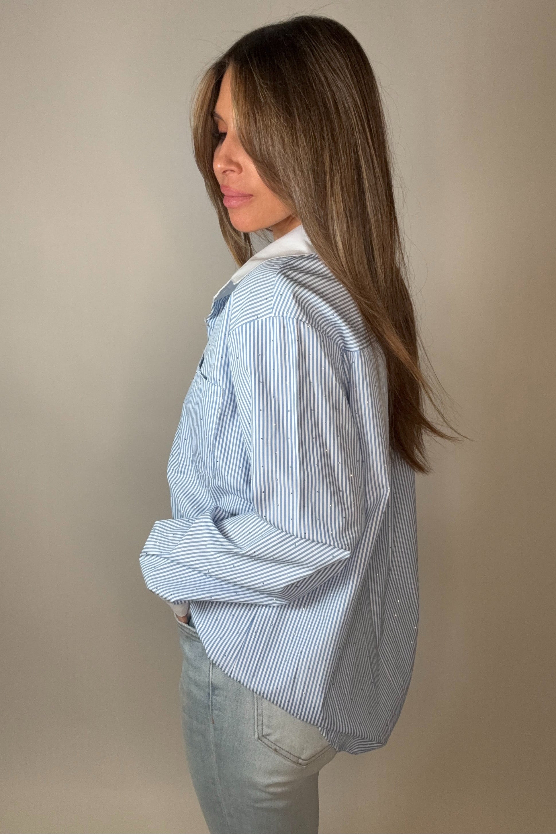 Elevate your everyday wardrobe with this versatile Crystal Striped Button Down Top. The classic striped pattern adds visual interest while the structured button-front design offers timeless appeal. One-size-fits-most construction ensures a comfortable fit for various body types, making it an effortless addition to any closet. Perfect for layering or wearing solo, this piece transitions seamlessly from casual weekends to polished workdays. Invest in quality basics that work as hard as you do.