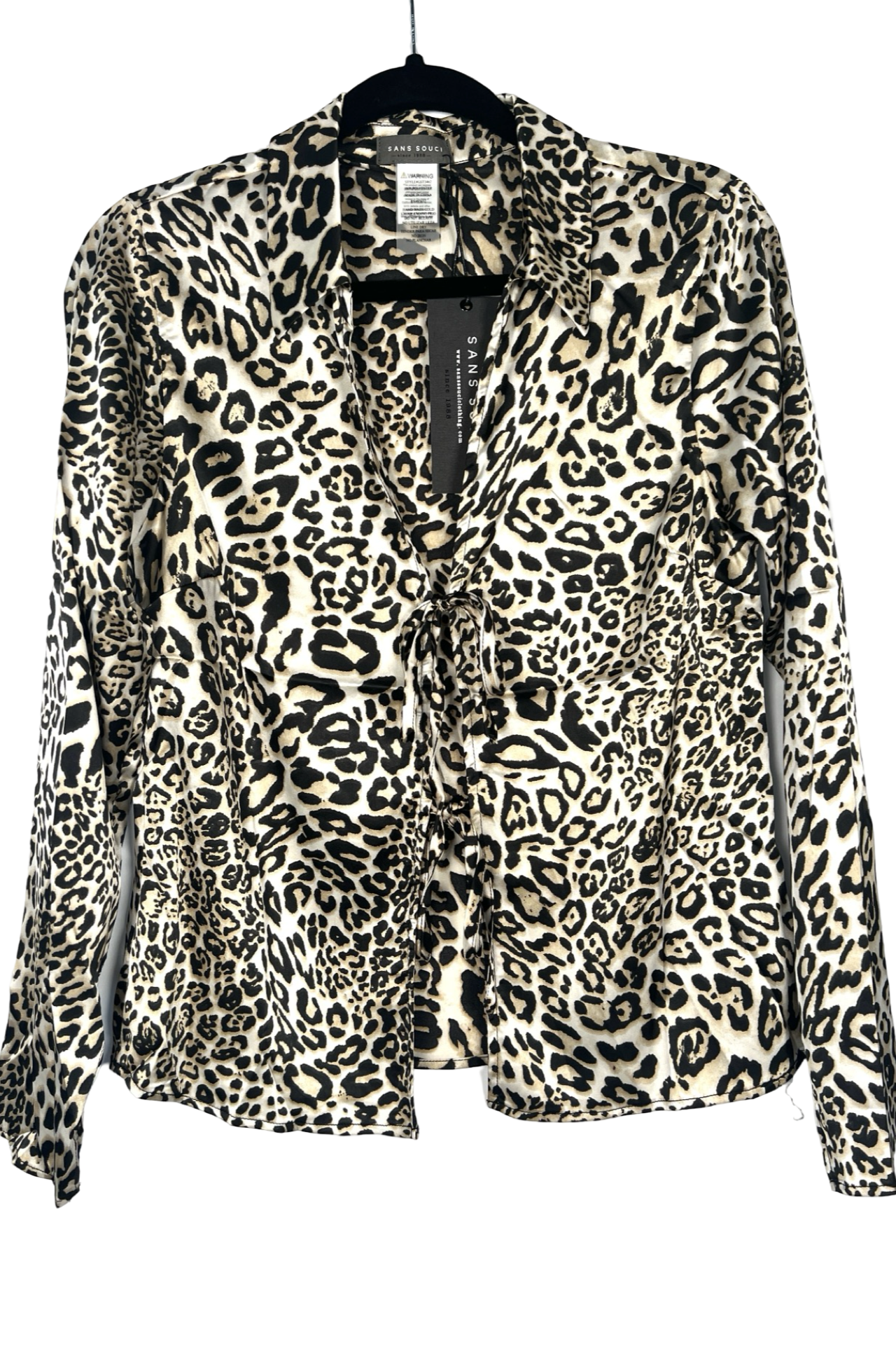 Crafted from luxurious satin material, this Leopard Tie Front Top boasts an open front design with 2 elegant ties. Perfect for any occasion, style it with jeans or a skirt and boots for a chic and sophisticated look. Elevate your wardrobe with this must-have piece.