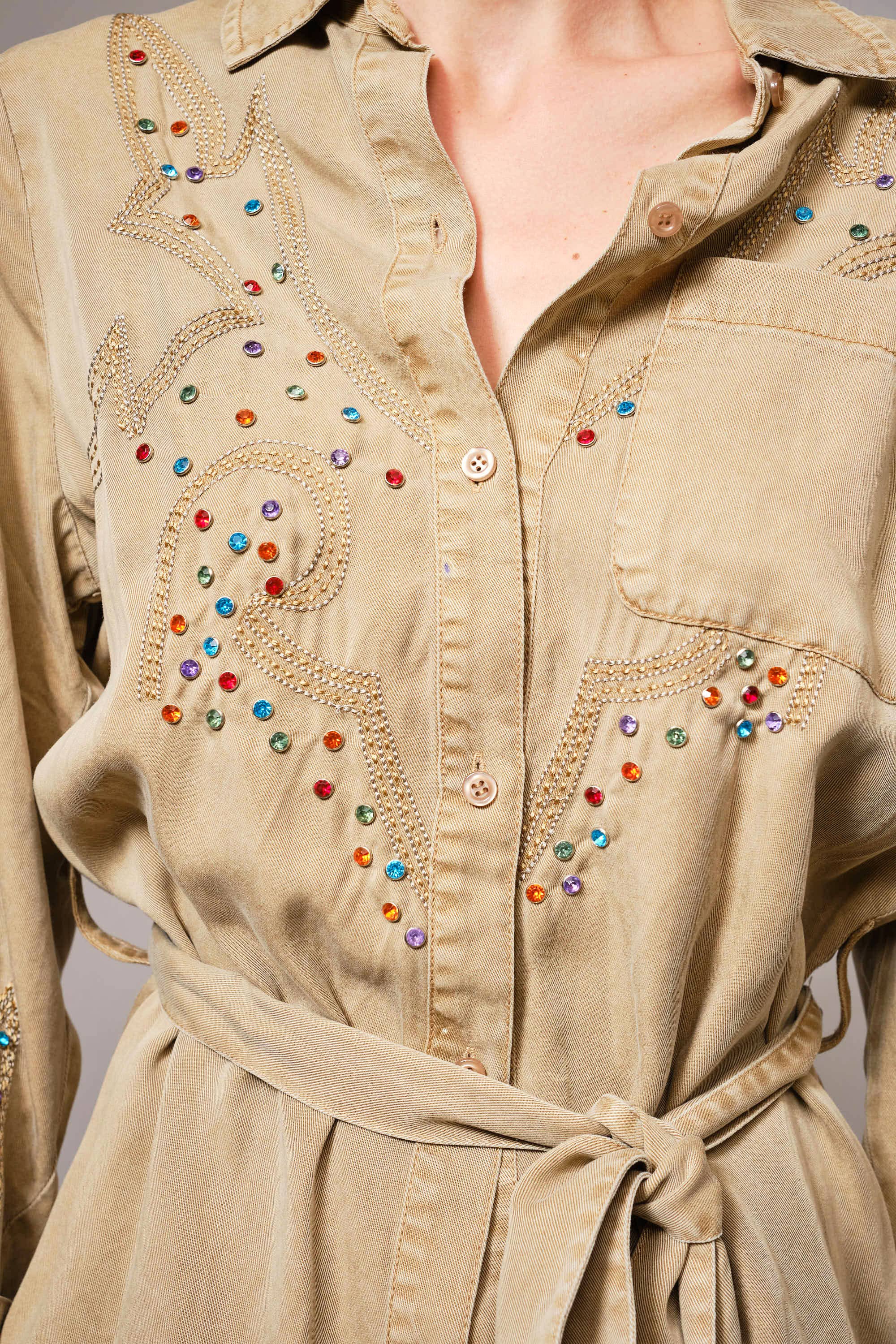 Tunic-style button-up shirt featuring embroidered stitch work, colorful studs, a belted waist, and a garment-washed finish.