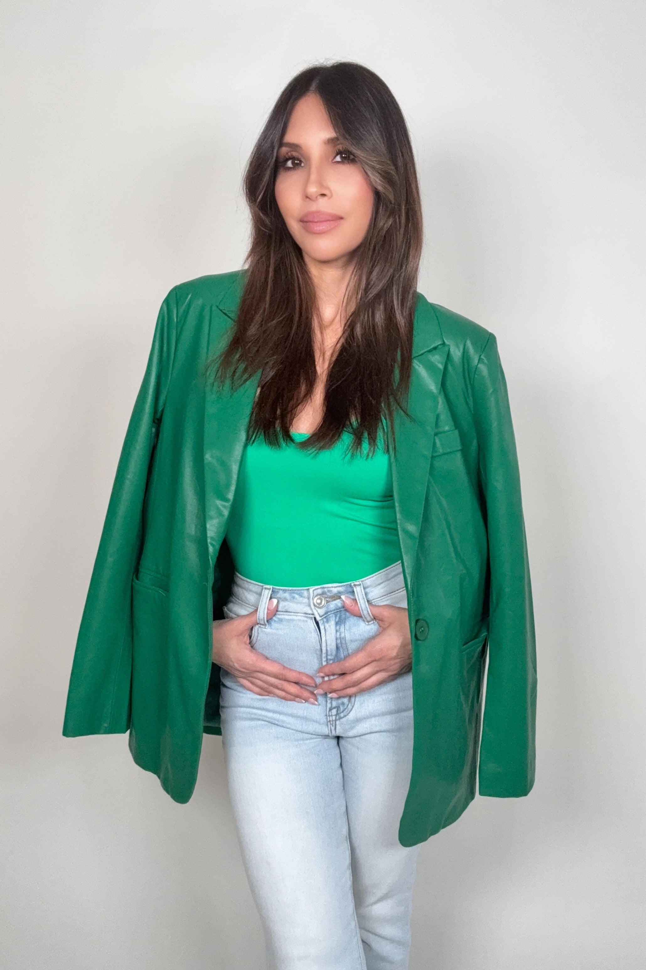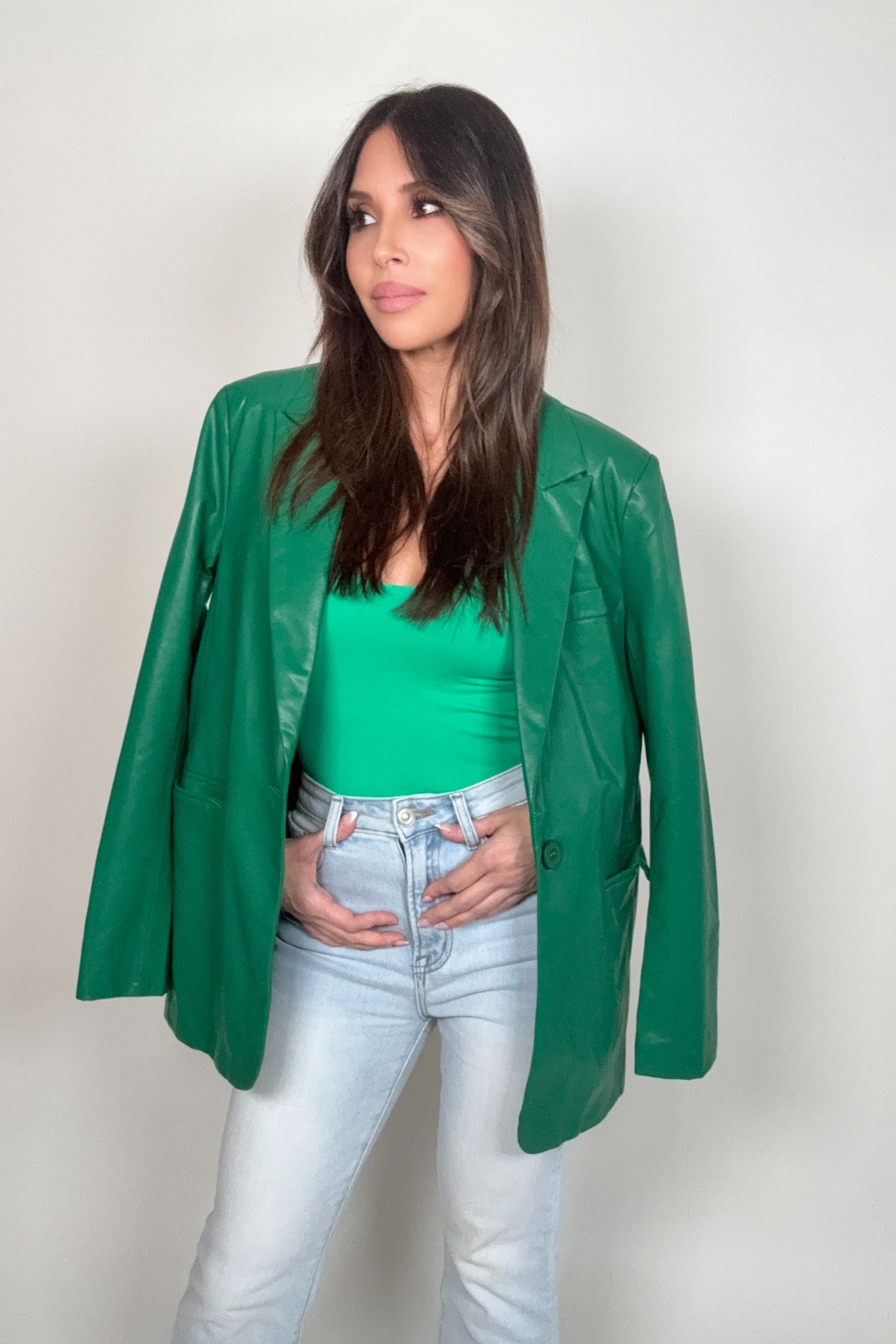 Elevate your style with our Green Oversized Pu Blazer. The buttery soft material and oversized fit exude luxury, while the vibrant green hue adds a touch of elegance. Make a statement at your next event with this versatile and stylish piece.