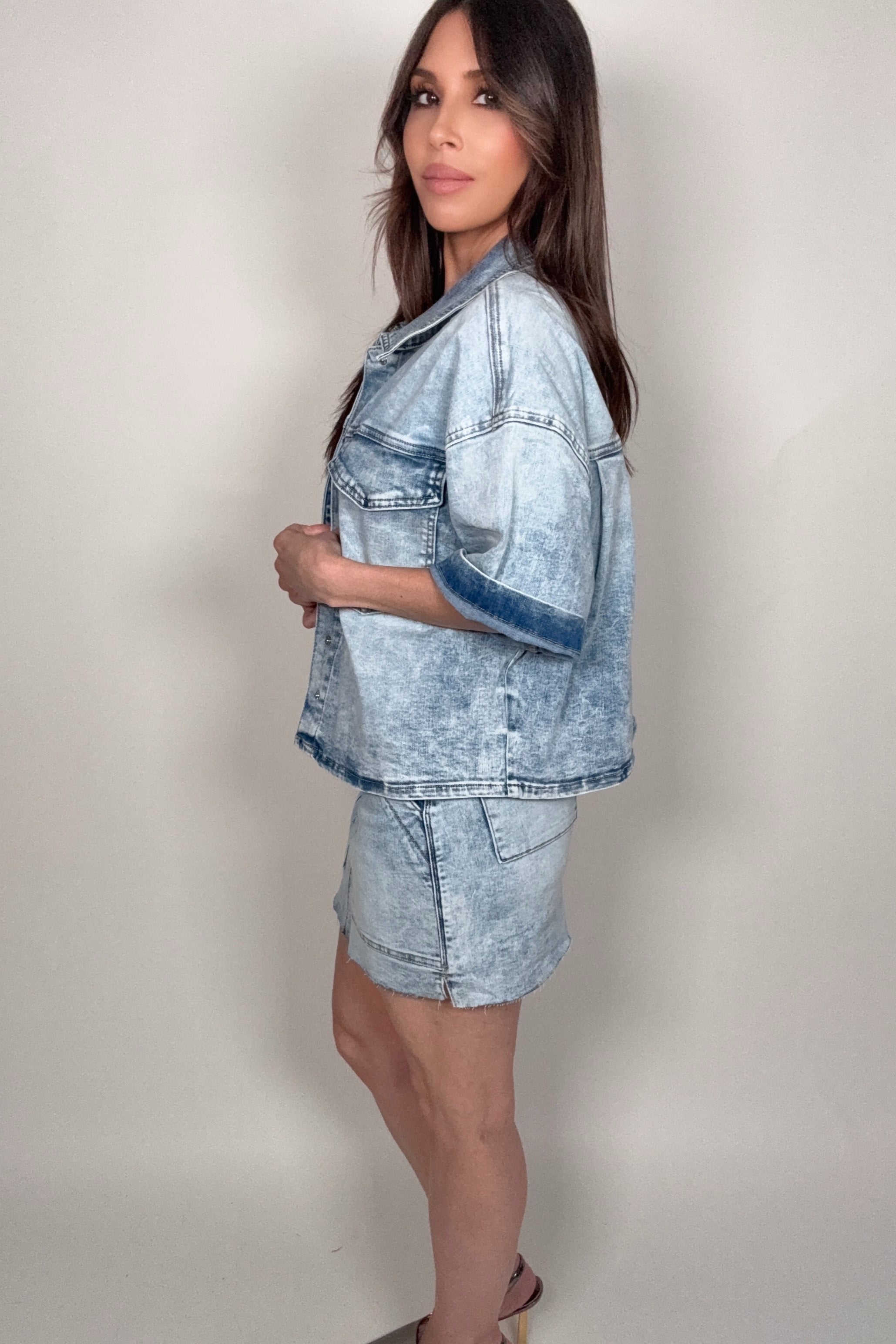 CRAFTED FROM COMFORT STRETCH DENIM MEDIUM(MEDIUM BLUE) TWO CHEST POCKETS, BUTTON PLACKET, COLLARED, SHORT SLEEVE, DROP SHOULDER DESIGN, REMARKABLE WASHING EFFECT, FINISHED HEM, DENIM JACKET CARE INSTRUCTION:MACHINE WASH S:CHEST 45 1/2'' / WAIST 44 1/4'' / SHOULDER 22'' / SLEEVE 9 1/2'' / LENGTH 21''