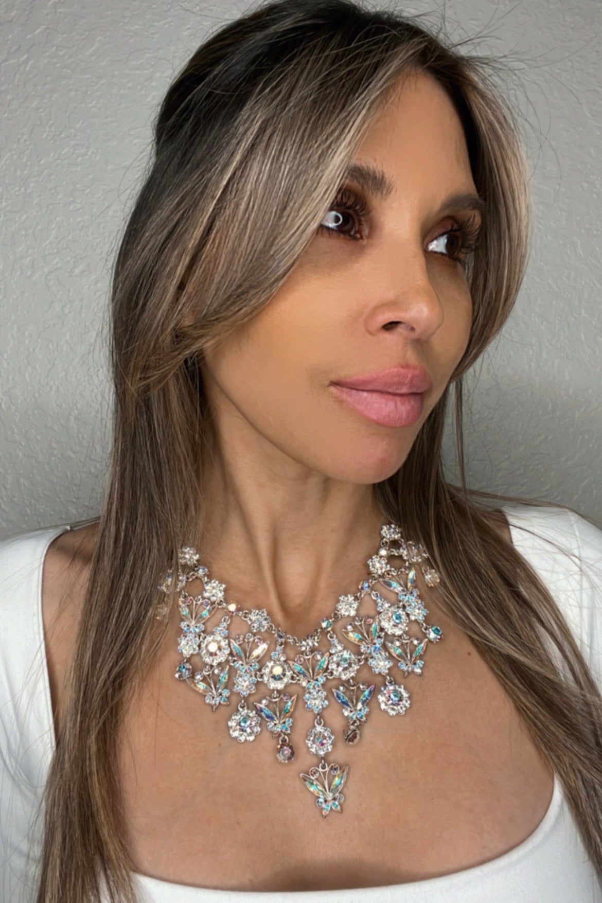 Introducing our Ultimate Crystal Multilayer Statement Necklace, a breathtaking fusion of elegance and opulence. Crafted with precision and adorned with shimmering crystals, this exquisite piece features multiple layers that add depth and dimension to any outfit. Perfect for making a bold and glamorous statement, elevate your style with this luxurious necklace that embodies sophistication and allure.