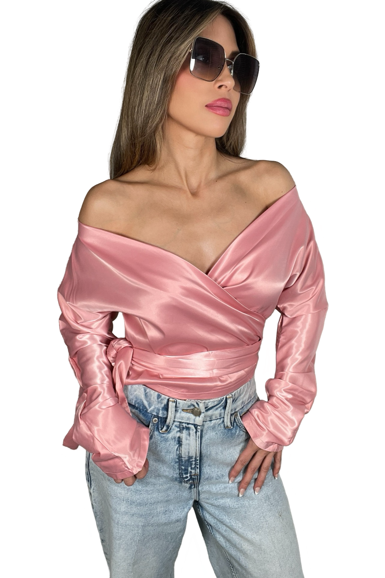 Unleash your boldness with our satin stretch blouse! Featuring an off the shoulder design and a unique wrap style closure, this top will make you stand out in any crowd. Perfect for those who love to take risks and make a statement. Don't be afraid to venture into new fashion territory with this daring piece!