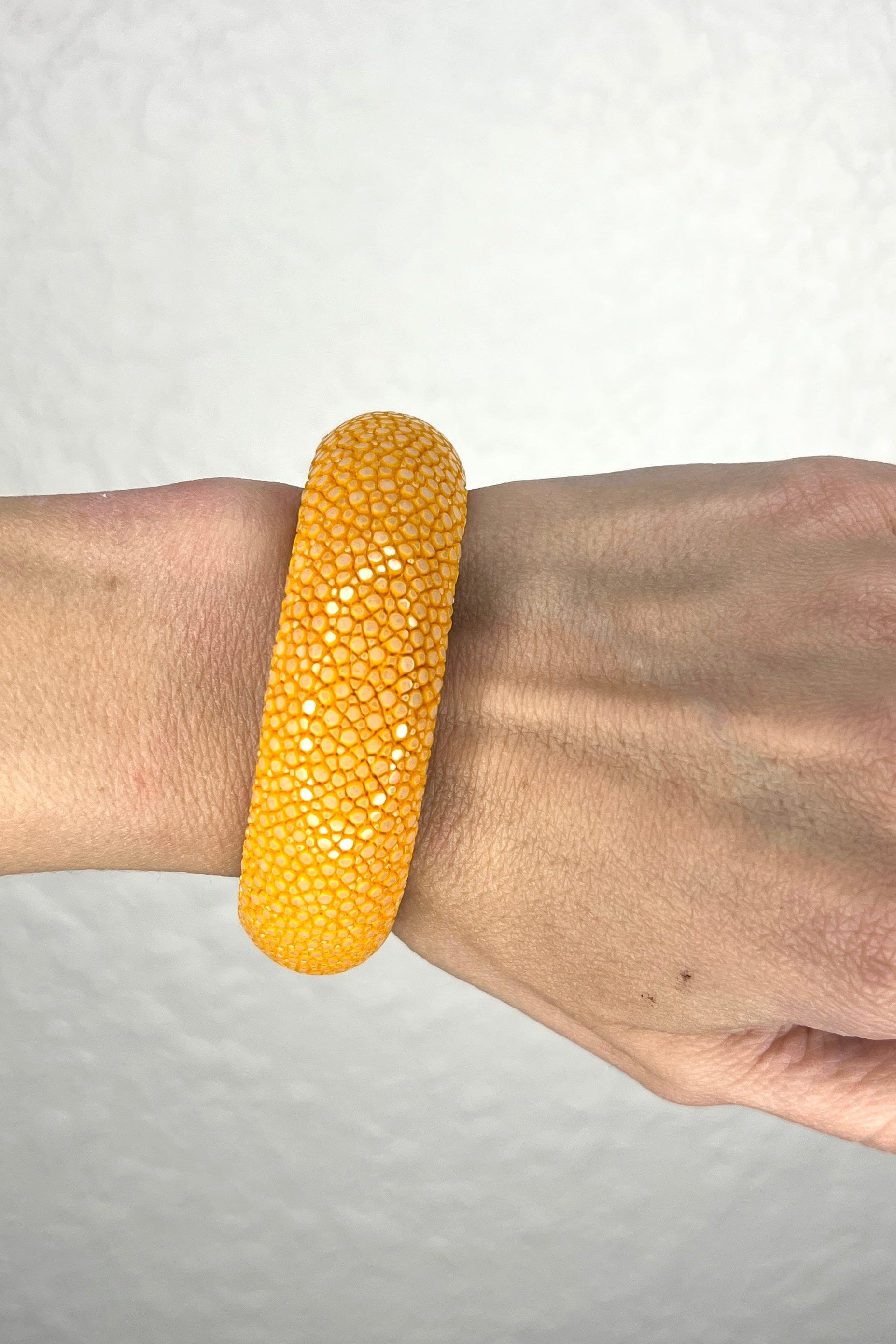 Introducing our Yellow Shagreen Cuff – a statement piece that seamlessly fuses contemporary style with exotic flair. Crafted with meticulous attention to detail, the yellow shagreen texture brings a touch of sophistication and texture to your wrist. This cuff is designed to make a bold impact, adding a pop of color and a modern edge to your ensemble. Whether worn alone or stacked with other accessories, express your unique style with confidence and embrace the vibrant charm of our Yellow Shagreen Cuff, a must-have addition to your jewelry collection.