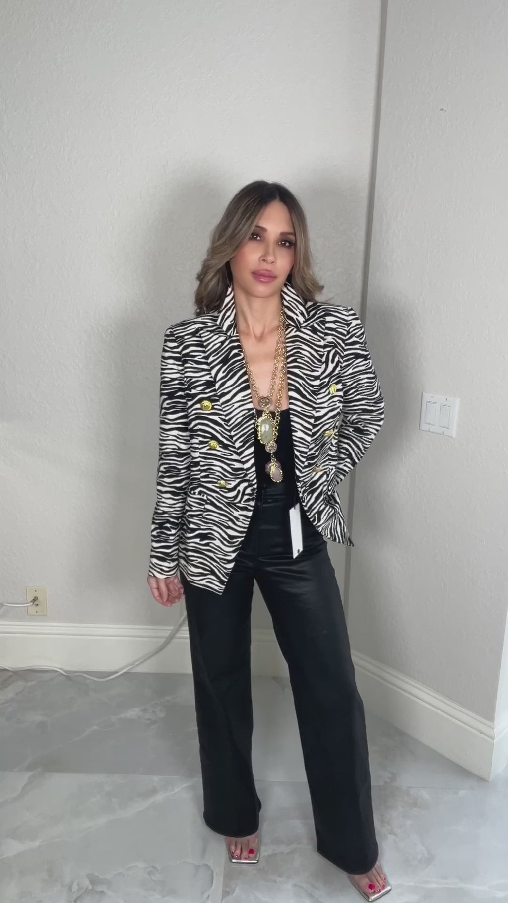 Experience luxury and sophistication with our velvety soft zebra blazer is adorned with gold tone buttons on the sleeves, adding a touch of elegance to any outfit. Make a statement and stand out in the crowd with this exclusive jacket.